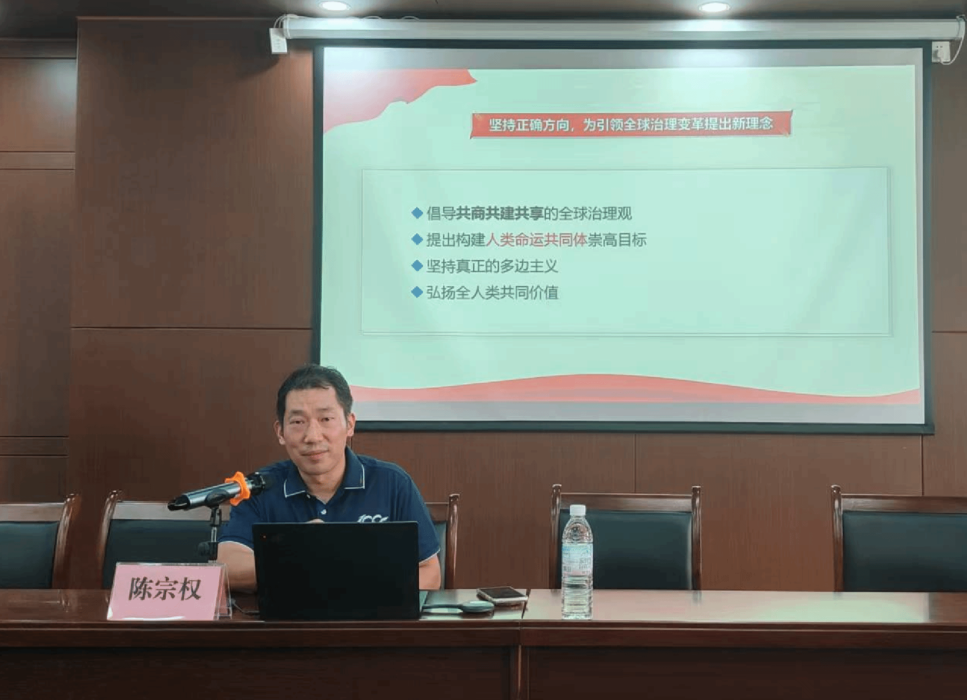 9月9日,学院邀请学校党委常委、党委宣传部部长陈宗权教授以《全球治理倡议正逢其时》为全体教职工作专题辅导报告,报告重点解读国际格局演变的趋势,系统阐述了全球治理体系变革的时机和中国推动全球治理体系改革的实践。报告指出,习近平总书记的重要讲话,为高校深化国际合作、服务国家战略提供了根本遵循。学院要立足学科优势,主动融入国家开放发展大局,以高质量人才培养助力构建人类命运共同体。