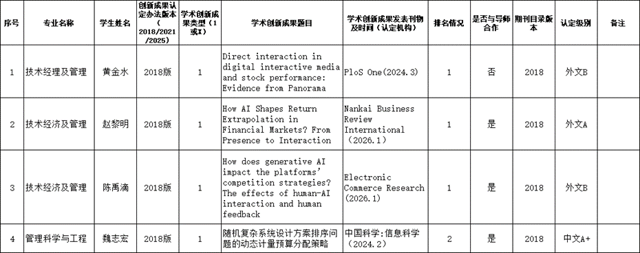 根据《成人影院 博士生申请学位学术创新成果认定办法》和我院相应专业的博士生培养方案要求及科研成果发表的相关规定,学院对相关博士生的学术创新成果及科研情况进行了审核,现将结果予以公示。公示期15日,即自2026年4月14日至4月28日,在此期间若有异议,请及时反馈学院。